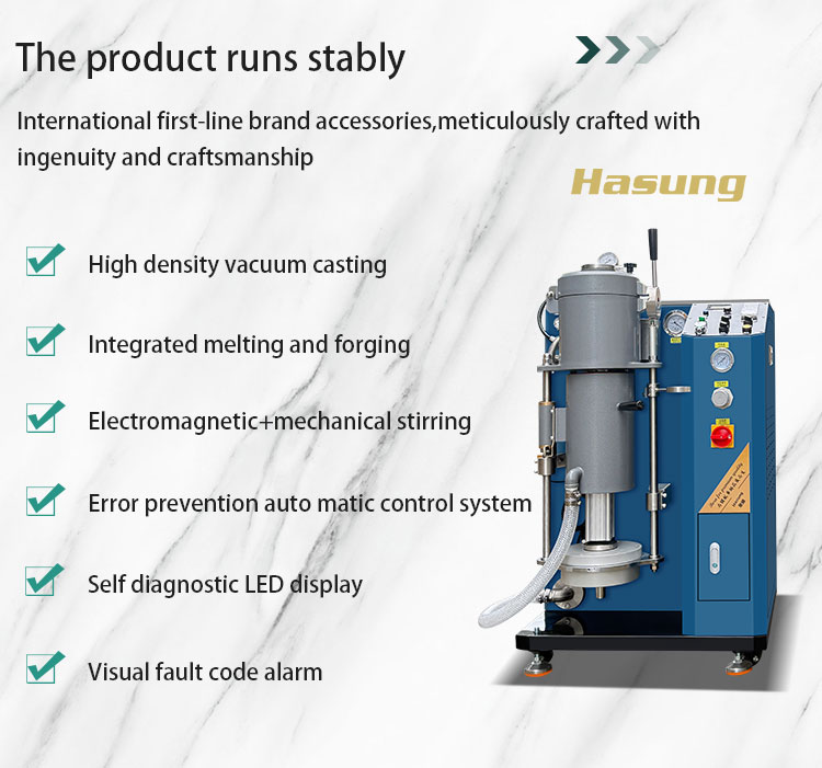 Hasung VC series vacuum pressure casting machines reach from small to large capacities, from semi-automatic systems to solutions for a fully automatic casting production. A lot of special features enable you to optimize each casting according to its individual characteristics. Generally, for gold silver jewellery casting purpose, the smallest capacity is from 1kg, 2kg, 3kg, 4kg up to 8kg, to maximum capacity such as 20kg or 30kg.