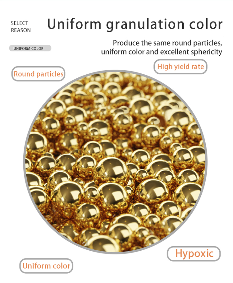 Secondly, because the vacuum pressurized granulator is protected by inert gas, the metal is casted in the condition of completely isolating the air, so the surface of the casted particles is smooth, free of oxidation, no shrinkage, and extremely high gloss.