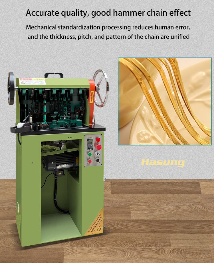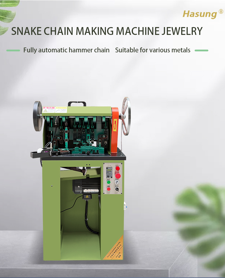 The Hasung fully automatic hollow snake bone chain machine is an automated professional equipment in the field of metal chain processing. It is equipped with precise hammer chain technology and is specially designed for mass production of hollow snake bone chains in industries such as jewelry. The equipment adopts a fully automated hammer chain structure, which can continuously produce without interruption, with efficiency far exceeding traditional manual and semi-automatic equipment. At the same time, mechanical standardization processing eliminates human errors, making the chain thickness uniform, pitch precise, and texture delicate. It also supports various precious and ordinary metal materials such as gold, K gold, silver, and copper, and is suitable for the processing needs of multi specification snake bone chains.