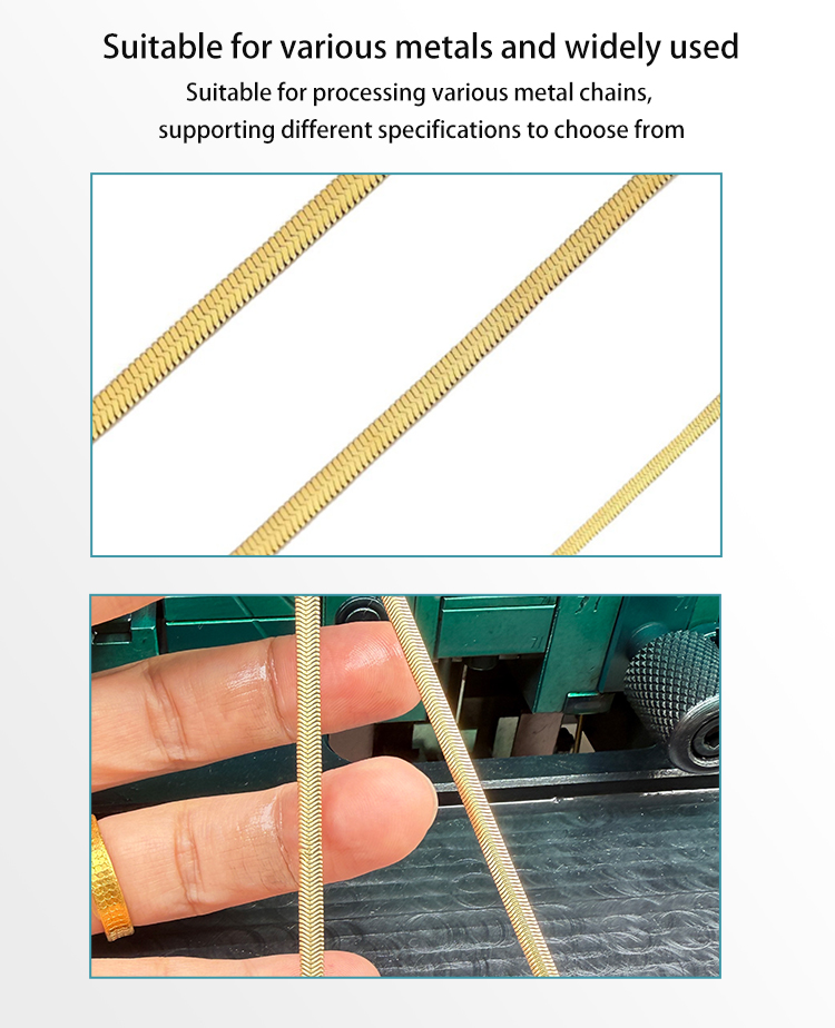 The application scenarios of this fully automatic hollow snake bone chain machine cover various processing and manufacturing industries, and the core is suitable for the jewelry industry. It can produce high-end necklaces, bracelets, snake bone chains made of precious materials such as gold and platinum; Also suitable for the fashion accessory manufacturing industry, mass producing trendy metal chains to meet the demand for light luxury accessories; It can also be applied in the field of hardware accessories processing, creating precision metal chain accessories for luggage and clothing. At the same time, it can serve the gift and handicraft industry, customize craft gift chains, and help enterprises in various industries enhance product added value and market competitiveness.