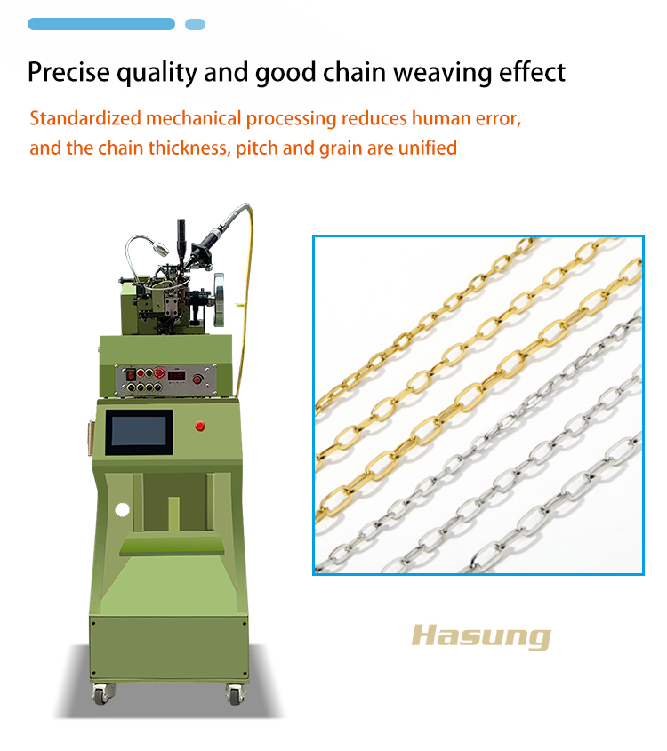 Whether it’s a jewelry brand pursuing high-quality chains or a hardware manufacturing enterprise focused on production efficiency, Hasung’s high-speed laser chain weaving machine can serve as a reliable assistant on the production line, helping businesses stand out in the fiercely competitive market with efficient and superior products.