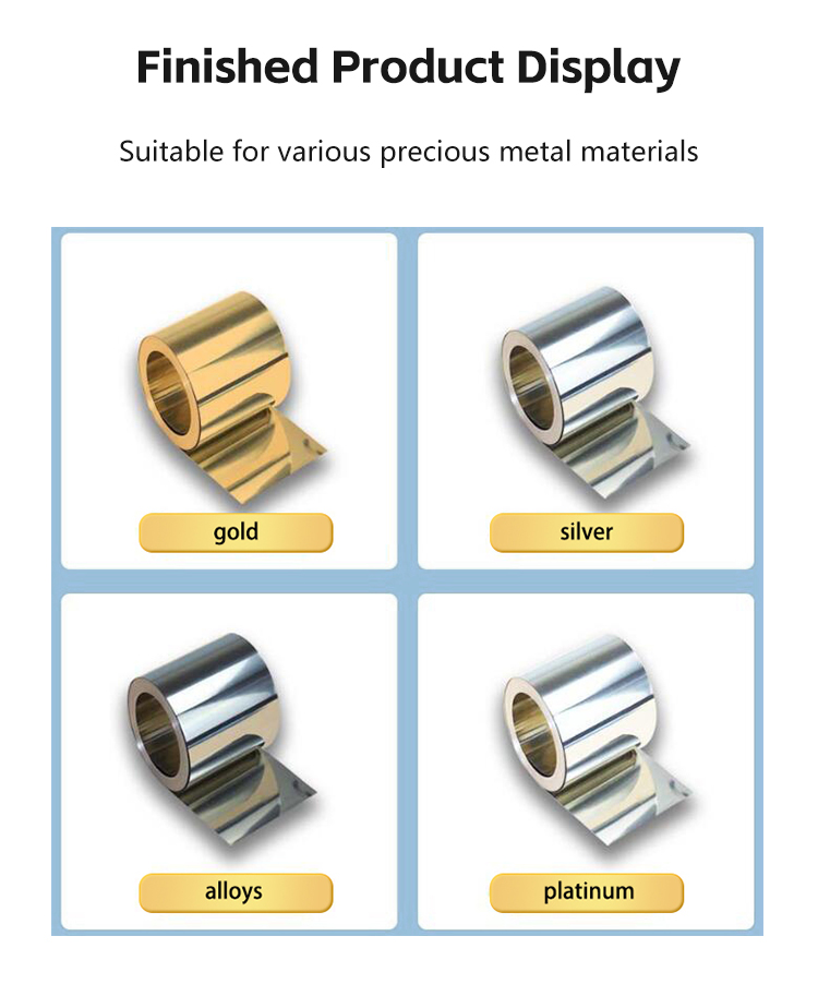 Widely used in industries such as jewelry, precision electronics, aerospace materials, etc., it can meet the processing needs from jewelry blanks, electronic ultra-thin metal foils to special alloy sheets. One stop coverage of multiple types of precious metal materials, helping enterprises achieve high-quality, high value-added precision manufacturing and enhance core competitiveness.