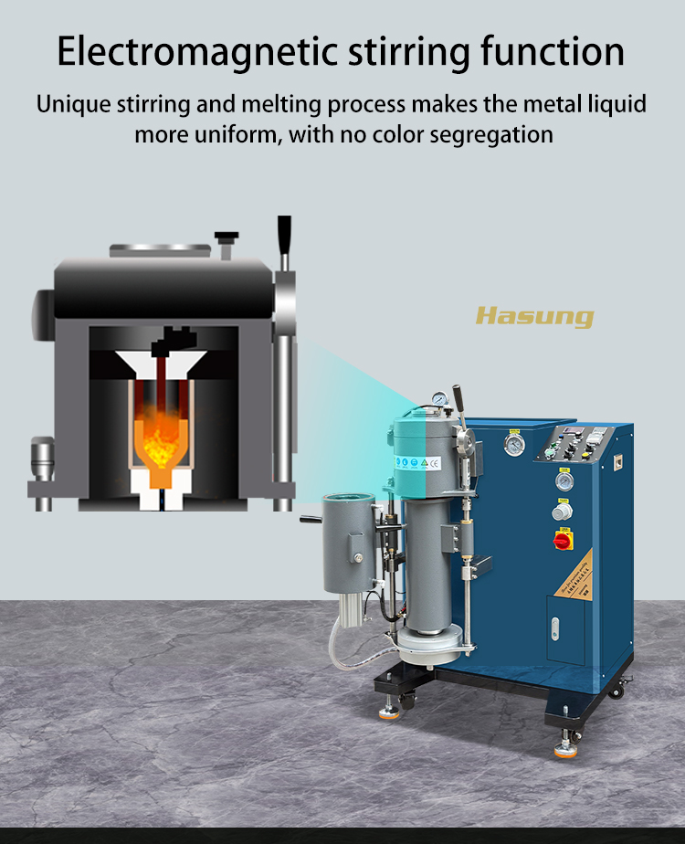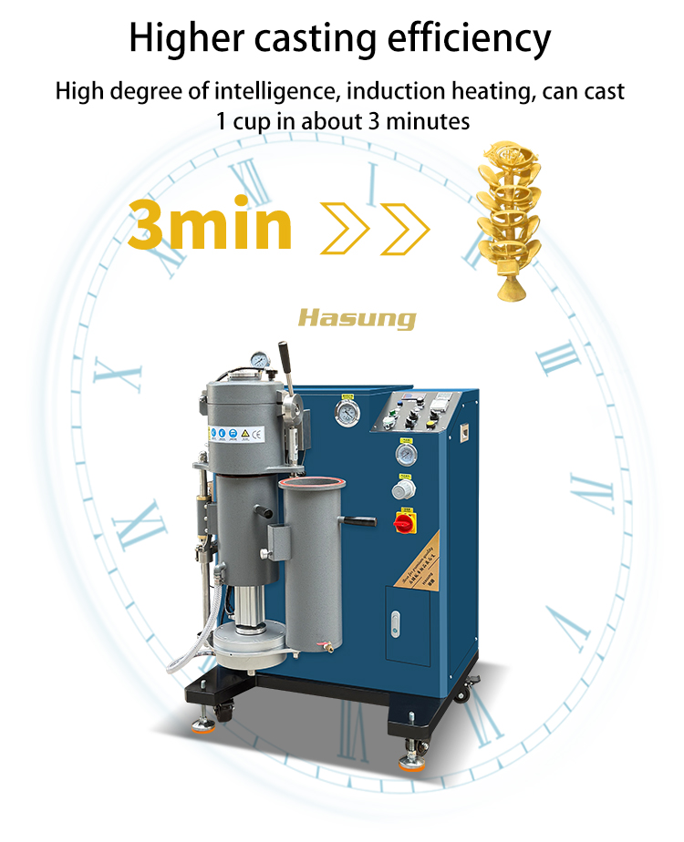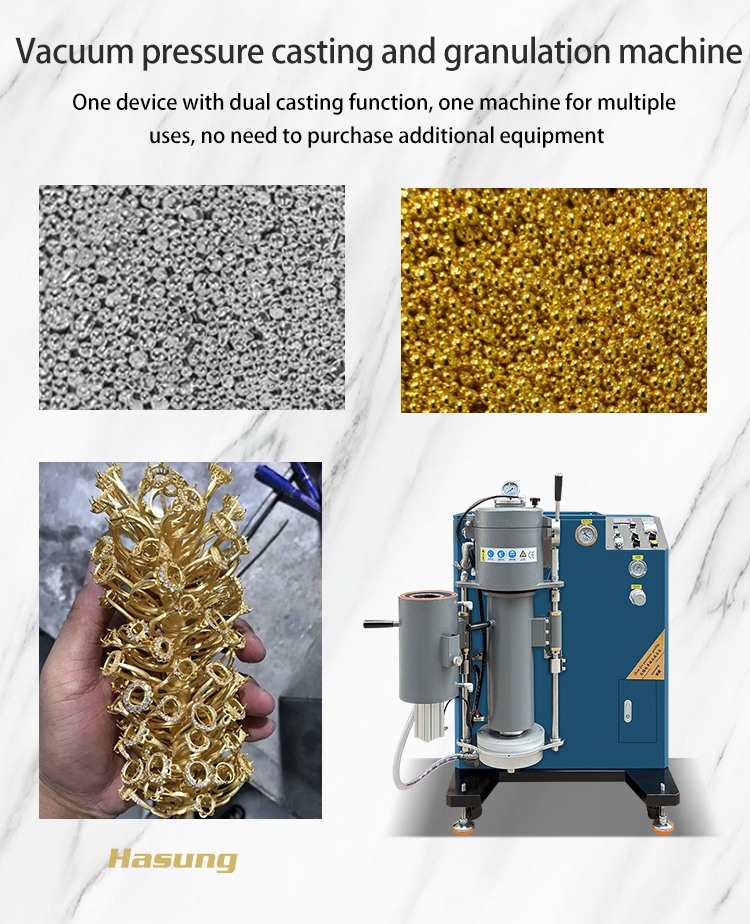 The Hasung inverted mold granulation integrated machine is a casting equipment that integrates dual core functions – it supports both fine inverted mold casting and metal granulation, and can cover various production needs without the need for additional equipment procurement. Its design is equipped with core technologies such as vacuum pressurization and electromagnetic stirring: the vacuum environment can avoid the formation of bubbles in the metal liquid, while electromagnetic stirring allows the molten liquid to mix more evenly. Combined with an intelligent temperature control system, it can stably cast highly complex handicrafts (such as silk pieces and precision jewelry), as well as mass produce uniform metal particles (gold and silver particles, etc.), balancing precision and mass production efficiency.